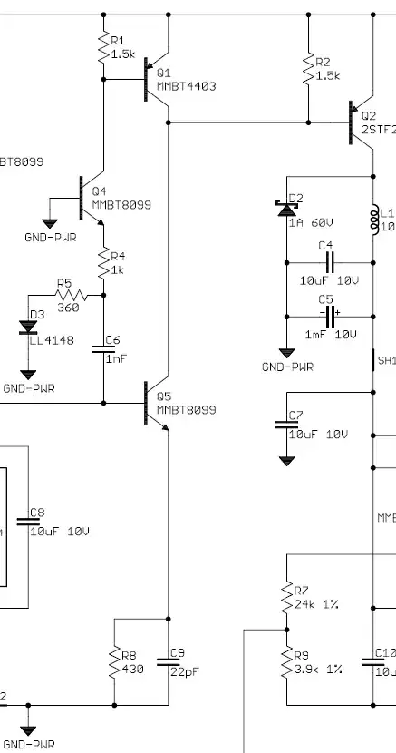 • @OlinLathrop I'll try to take a stab at what Q1 and Q4 are doing in the circuit. First, Q1 appears to form a push-pull type arrangement with Q5. Note: a current through R1, downward, will cause Q1 to turn on. Q5 turns on/off the switching BJT (Q2) via the uC. When the uC pin is high, Q5 to turn on which turns on Q2. When the uC pin is low, we want Q2 to turn off quickly. Ideally, we'd like to pull Q2's base high to the positive rail to turn Q2 off quickly. Q1 is there to short out R2 and pull Q2's base to the rail when Q1 turns on. – mrbean Feb 20 '21 at 18:53