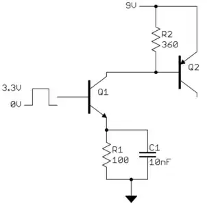 We can speed up Q1 a little quite easily by putting a cap across the emitter resistor. This will provide a small surge of current when first turning on, and will turn the it off more rapidly when the base is brought to ground suddenly by the digital output. Aiming for a 1 µs time constant puts the capacitor at 10 nF.