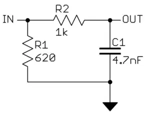f = 1 / 2 * Pi * R * C = 34 kHz