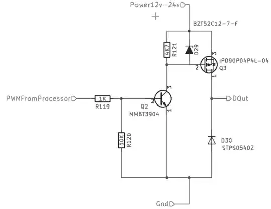 However, overall I don't like this circuit for "PWM" because the gate is driven with relatively little current and the switching transition times will be long. A second BJT that clamps the gate voltage to the supply, but turns on for only a short time at the on-to-off transition would help. With a little cleverness, you can capacitively couple that from the high to low transition of the digital signal. But, the details of this are getting beyond the scope of this question.