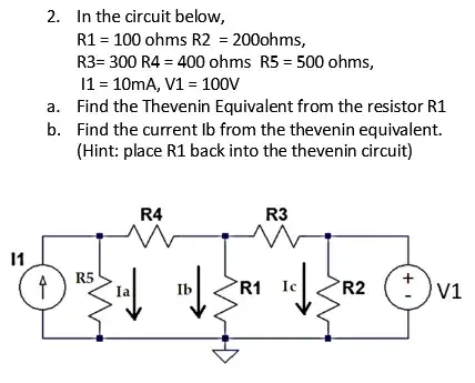 So to get started on part a I am finding the REQ of the circuit by shorting it. Now to get from A to B in this circuit that is having R4 and R5 in series with R3 in parallel so REQ = (1/900 + 1/300)^-1 = 225 ohms. That is assuming R2 is skipped because it goes directly to ground after R3. To finish up the Thevenin Equivalent I need to find a voltage, but I have no clue where to go from this.