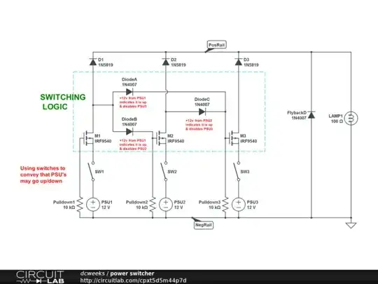 LOGIC: I am trying to come up with a better plan than two DPDT relays stacked. OR-ing would probably be even better but makes me nervous. So I have designed the circuit below using P-MOSFETS thinking it might be a tiny bit safer to try to keep supplies somewhat isolated. (Is this a bit like being somewhat pregnant?) Using IRF9540 p-channel MOSFETS circuit is intended to failover from lower to higher numbered supplies. For example, when Supply1 is active it pulls up M2/M3 gates for Supply2 and Supply3 to disable them. So only Supply1 will flow. And then Supply2 if enabled similarly disables Supply3. I thought the logic of P-MOSFETS was most suitable because it hopefully will be simple to use +12v signal from one supply to gates of MOSFETS controlling the others will disable their current flow.