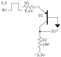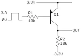 I have an RF switch chip that is controlled by a logic signal with levels of 0 V and -3 V. I want to control this from a CPLD that's producing ordinary +3.3 V CMOS levels.