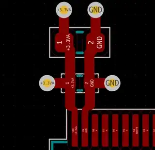 Is it better to have only two vias as shown on the first image, so that current "must" flow through both capacitors before reaching the pin (and that's where I might misunderstand how current flows, maybe I have an understanding of it that is too "directional"), or should I also add two vias next to the 0.1 µF capacitor (second image) which I believe could reduce the parasitic inductance but makes me think that some current not filtered by the 1µF cap comes directly from the power plane through the 0.1µF cap to the pin ?