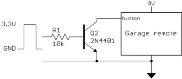 Second, why worry about the remote? The garage door opener should have a manual trigger, which is just a regular pushbutton on a wire. You can drive this with a transistor, or with a small relay that you in turn drive with a transistor or optocoupler.