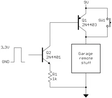 Q2 will sink about 2.7 mA when the digital signal is high. Figuring Q1 should have a gain of at least 50, that will allow the block to draw up to 130 mA, which is probably a lot more than a garage remote draws. Adjust R1 accordingly if more current is needed.