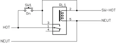 This construct is called a electrically latching relay. When the relay is energized, pins 1 and 3 are connected, which keeps the incoming AC power applied to the relay coil. This keeps the relay on and SW-HOT on as long as the incoming power stays on. If the incoming power goes off, the relay turns off. Once off, it stays off even if power is re-applied. After power is re-applied, SW1 needs to be pressed for a short time to turn the relay on again.