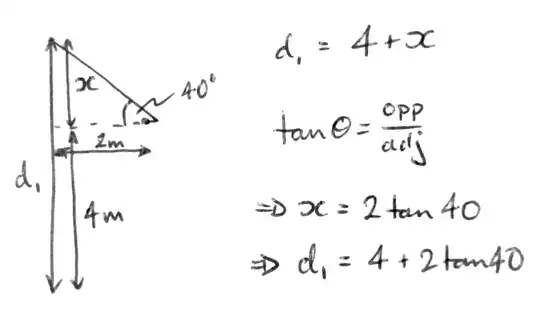 Point B is a certain distance upwards from Point A. How much? You know the distance that it is to the left from Point A ($2\text{m}$) and the angle that it is from point A ($40°$), so using standard trigonometry $\tan(\theta)=\frac{opposite}{adjacent}$, you can calculate the vertical distance by rearranging to give: $opposite=adjacent\tan(\theta)$, or in this specific case, $x=2\tan(40)$, such that $d_1 = 4+2\tan(40)$.