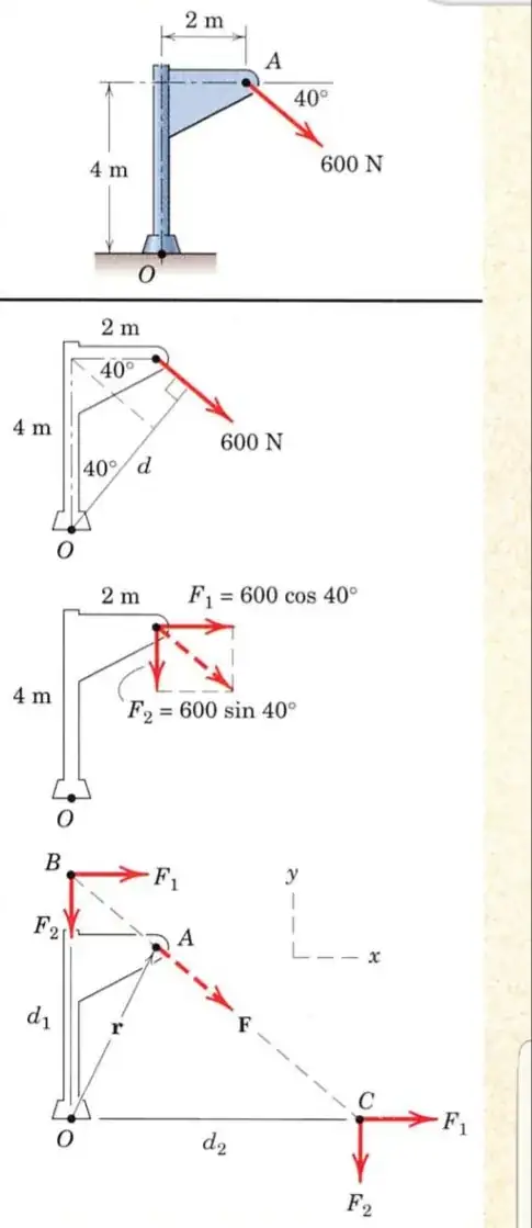 In my engineering textbook, I didnt understand the example given to explain the magnitude of the moment. It asks to calculate the magnitude of the moment about the base point O of the 600-N force in five different ways. Now, I dont understand the third way it calculated the moment. What I don't understand is why d(1) = 4 + 2 tan(40) and so the moment is 460(d(1)).