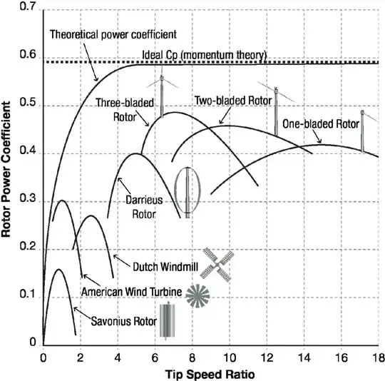 So the reality is that for an ideal rotor in real air that creates a uniform wake around the entire cylindrical shell at all radii from hub to tip, accounting for profile drag, induced drag, swirl, and real tip vortex core phenomena, The optimum power coefficient is about 0.55 at a tip speed ratio in the five to six range.
