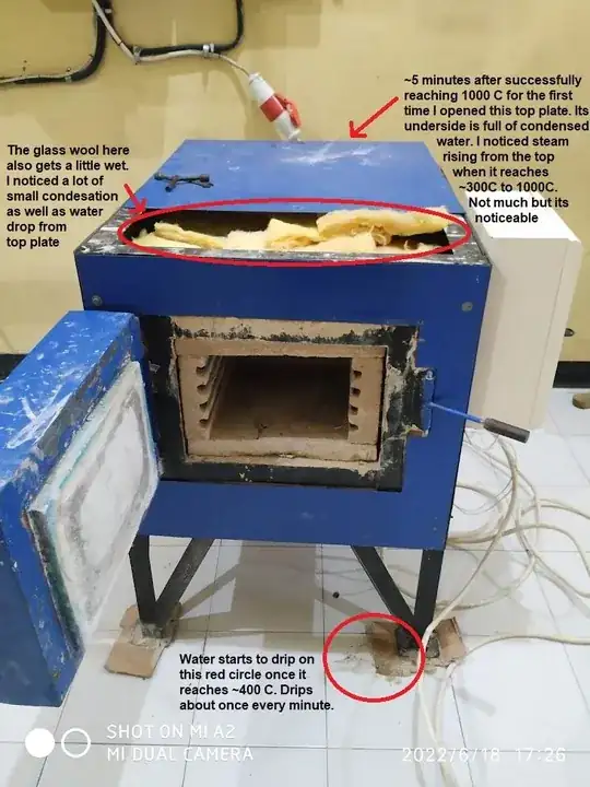 ~5 minutes after successfully reaching 1000 C for the first time I opened this top plate. Its underside is full of condensed water. I noticed steam rising from the top when it reaches ~300C to 1000C. Not much but it's noticeable.