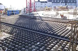 Creating voids in slabs using voidformers (cans, or in this case plastic balls) is an accepted way of construction and fullfills Eurocode requirements.