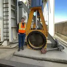• Using your left hand, pull the assembly to the left to reveal the tab on the right. While pulling on the assembly, use a flat-head screwdriver (1 x 3 mm) to press the tab inward to release.