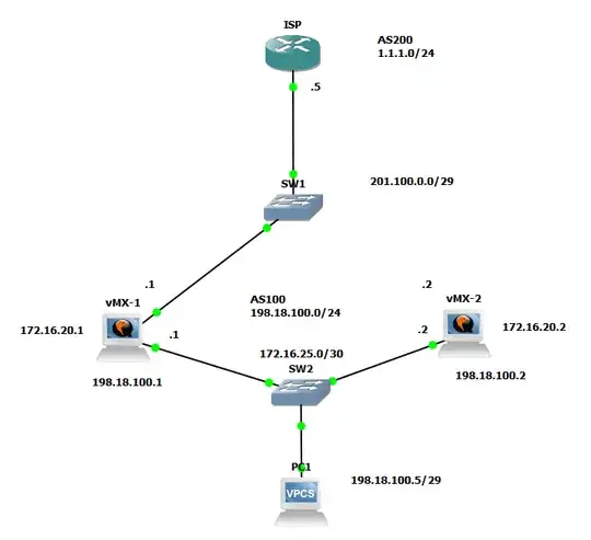 - vMX-1 and vMX-2 share virtual IP 198.18.100.3 via VRRP; this IP is set as default gateway for PC1 (198.18.100.5);