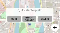 Straßenname Über die Position des Fadenkreuz wird der zugehörige Straßenname ermittlt. Dieser kann über den Eintrag unter der "0" (nach oben wischen) manuell geändert werden.