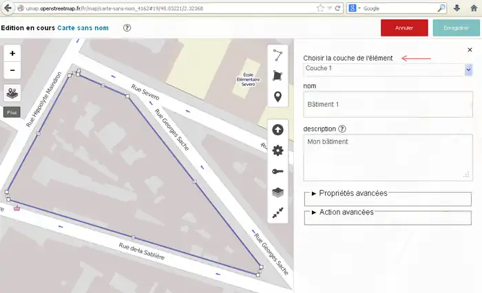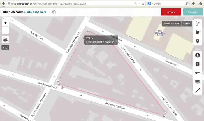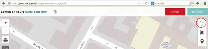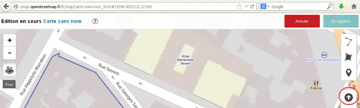 2) 左サイド7番目のボタンをクリックしてその右に開いた窓で「東京駅」などのように移動先を指定してエンターキーを押します。(2014/11/30現在、この機能はフランスの製品版インスタンスでは無効です。他(例えば http://umap.fluv.io )では有効です。)