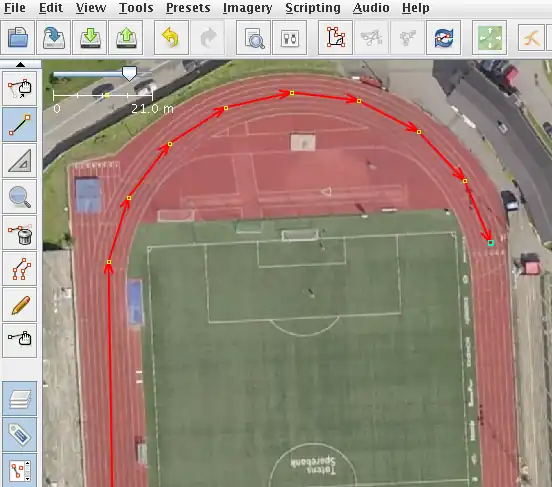 - One way and 3 nodes (in that way) selected: The arc is "fused" into the selected way at the position of the selected nodes.
