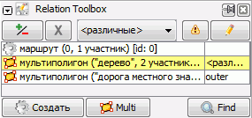 If you need to work with a relation which members are hard to find (for example, some master relation of relations), you may search for it with [Find] button. Relations in the searching dialog are filtered by keywords, which are separated by spaces. [Find] is a very useful feature but it only finds relations that are present in the downloaded area.