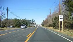 A road with one lane in either direction plus a center turn lane. The center turn lane can be used by traffic going in either direction at any time to turn at any point along the lane. This configuration is common in some countries but rare or nonexistent in others. | |