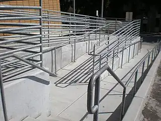 A ramp that can be used by wheelchairs (typically, also by strollers). Such a ramp should be no steeper than 4-6% and wide enough to accommodate a wheelchair. A stroller ramp might be steeper or narrower. |