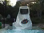Riders drop from inside a tunnel out into the ride's main element shaped like a funnel on its side. Riders oscillate from one side to the other until they exit through the back of the funnel and into a splash pool.