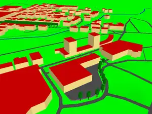 Writes an OpenGL rendering of the 3D model generated from example.osm to image.png. The rendering uses a perspective projection, with the defined coordinates for camera position and look at.