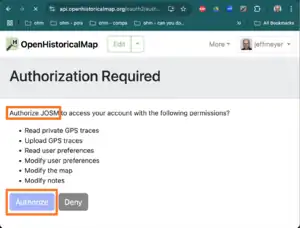 - An Authorization Required page should have opened in your default Web browser, asking you to grant JOSM several permissions. Click Authorize.