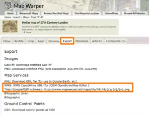 Finding the georectified map URL to put in your editor in Mapwarper's Export tab.Mapwarper.net - this is a great tool for georectifying maps you may have downloaded.