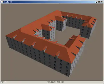 Propozycja ta jest tutaj uzupełniona o grubość płaszczyzny dachu. Celem jest jeszcze bardziej zbliżone do stanu rzeczywistego modelowanie budynku w 3D. Często nie uświadamianym sobie dylematem tworzenia modeli 3D na podstawie zdjęć lotniczych jest fakt, że rysując na ich podstawie budynki, rysujemy tak naprawdę jako rzut budynku rzut płaszczyzn dachu który zazwyczaj jest większy niż rzut budynku w parterze.