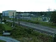 Traction substation with two 26.5 MW Motor–generator-sets. Power is taken from the 110 kV 50 Hz 3-phase-grid and converted to 110 kV 16,7 Hz single-phase current, which is transmitted to other substation, but also transformed to 15 kV power to be fed in the overhead lines. Energy flow can be from the national grid to the railway grid or vice-versa. | |