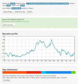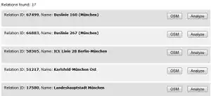 At the same time you can extract a relation as a GPX or KML file for your GPS device or view it directly in the OSM map. The export for navigation only makes sense if the relation is in one piece. Additionally it supports the JOSM RemoteControl, so you can find and fix the relation gaps (bugs) right away! Use the search function to find a relation by name.