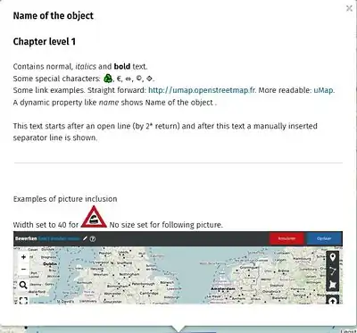 The example shows a popup where several options are used. The description of this object has following text: