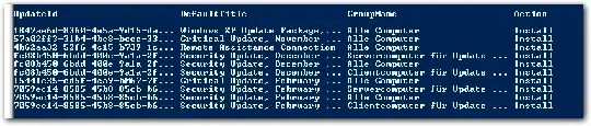 $record=""|Select-Object ComputerGroup,UpdateName, UpdateID
