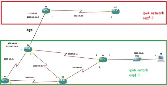 I activate bgp between this 2 networks(R6 and R1) and now R6 can ping the full ipv6 network and R1 can ping the full ipv4 network.