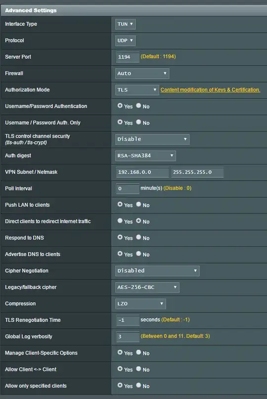 I have an Asus router with Asuswrt-merlin firmware installed. I have the DHCP server on my router give out addresses in the 192.168.0/24 subnet. My OpenVPN server is configured as seen on this image. The VPN subnet / netmask is 10.8.0.0 / 255.255.255.0. The Push LAN to clients, and both the DNS settings are set as shown in the image.