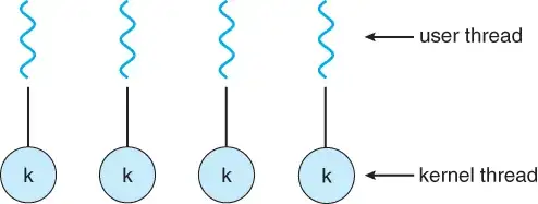 One-to-one model: concurrency is improved up to the number of user threads, and performance is also improved up to the number of processors.