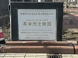 The Ürümqi Revolutionary Martyrs Cemetery (ئۈرۈمچى شەھەرلىك ئىنقىلابىي قۇربانلار قەبرىستانلىقى, Chinese: 乌鲁木齐市革命烈士陵园), alternatively referred to as the Martyrs' Mausoleum of Yan'erwu (Chinese: 燕儿窝烈士陵园), serves as a commemorative garden for martyrs situated in the Tianshan District, Urumqi City within the Xinjiang Uyghur Autonomous Region, People's Republic of China. The memorial commemorates martyrs including Chen Tanqiu, Mao Zemin, Lin Jilu, and Burhan Shahidi, who were former Red Army soldiers and officials, as well as those who perished during the Three Regions Revolution and in the Sino-Indian and Sino-Vietnamese Self-Defense Counterattacks. The Urumqi Revolutionary Martyrs' Mausoleum has been designated as the Xinjiang Uygur Autonomous Region Cultural Relics Protection Unit, the National Patriotism Education Demonstration Base, and included in the National Anti-War Memorial Facilities and Sites List.[1]
