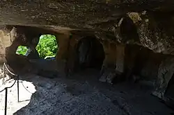 İnceğiz village is located about 9 km (5.6 mi) northwest of Çatalca.[1] The cave monastery is situated at Karasu Valley overlooking Karasu Creek. It is a four-story apartment building of rock-cut architecture. The structure was cut out in limestone formation, which has a suitable lithography for easy forming.[2] The site in the cliff is accessible by a wooden staircase on the trail. The openings of the cliff dwelling are barred by chains.[3]