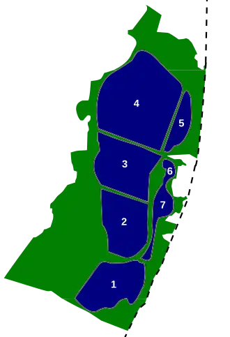 Ponds of the Łężczok Reserve before the 2015 expansion. Ponds: 1 – Brzeziniak, 2 – Babiczak Południowy, 3 – Babiczak Północny, 4 – Salm Duży, 5 – Salm Mały, 6 – Tatusiak, 7 – Grabowiec