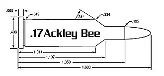 The .17 Ackley Bee is a wildcat centerfire rifle cartridge named after its designer, P.O. Ackley, and is a .218 Bee case necked down to .17 caliber with a sharper shoulder and less body taper. Being a rimmed case, it was popular in single shot rifles such as the Martini Cadet and Low Wall Winchester.[2] The caliber is well suited to varmint hunting particularly where minimal pelt damage is required.
