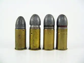 The .476 Enfield, also known as the .476 Eley, .476 Revolver, and occasionally .455/476,[1] is a British centrefire black powder revolver cartridge. The Enfield name derives from the location of the Royal Small Arms Factory at Enfield Lock, the armoury where British military small arms were produced, while Eley was a British commercial brand.[2] Used in the Enfield Mk II revolver, the Mk III variant was introduced by the British Army in 1881,[1] supplanting the earlier .476 Enfield Mark I and II cartridges, which in turn had replaced the .450 Adams cartridges, all of which also used black powder propellant.[1]