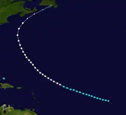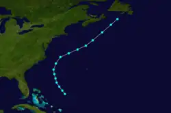 The bark Colchaqua encountered this storm nearly 900 mi (1,450 km) west of the Capo Verde Islands on August 29, recording sustained winds of 46 mph (74 km/h).[13] Moving towards the west-northwest, the storm steadily gained strength, and reached hurricane strength early on September 2. The storm peaked its peak intensity of September 6 with sustained winds of 90 mph (150 km/h) and a minimum atmospheric pressure of 980 mbar (29 inHg),[3] the former recorded by the ship Swallow and the latter by the ship State of Virginia.[13] Moving just to the west of Bermuda, the cyclone began to turn more northerly, and transitioned into an extratropical cyclone later on September 7. By the following day, the system made landfall in Newfoundland as an extratropical system.[3] On Bermuda, the hurricane generated huge swells and strong winds, causing sea spray that defoliated plants across the territory.[14]: 5  Approximately 1 in (25 mm) of rain fell in Halifax, Nova Scotia, during a 3.5 hour-period as a result of the storm.[11]: 37  The 2014 reanalysis study by Chenoweth concludes that this storm formed on September 2 and intensified more than HURDAT suggests, peaking as a strong Category 2 hurricane.[5]