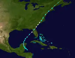 On September 25, a tropical storm was first noted in the western Caribbean, north of Honduras. Upon striking the Yucatán Peninsula shortly afterwards, the storm briefly weakened into a tropical depression. However, when the system emerged into the Gulf of Mexico, it attained tropical storm status once again. Steadily gaining strength, the cyclone reached hurricane status on September 28, after reports from the ship Emma D. Finney indicated such.[4] Moving north-northeastward, the storm made landfall near Cedar Key, Florida several hours later, with an estimated minimum central pressure of 981 mbar (29.0 inHg). The system briefly fell to tropical storm status over the state, but strengthened into a hurricane again after exiting near Jacksonville and crossing the Gulf Stream. It hit South Carolina as a hurricane that same day, with the center passing just east of Charleston and west of Wilmington.[15]: 13  The storm lost hurricane status again over eastern North Carolina. Thereafter, the system crossed the northeastern United States, becoming extratropical on September 30 over Maine. On October 1, it dissipated over eastern Canada.[3]