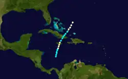 The track for this storm begins about 290 mi (465 km) northwest of Barranquilla, Colombia, on October 31,[3] one day before Jamaica first observed sustained hurricane-force winds.[13] Moving towards the east-northeast, the storm attained hurricane status on November 1, while situated just south of Jamaica. Upon making landfall in the island nation near Rocky Pointon November 2, the storm strengthened into a Category 2 hurricane with 105 mph (165 km/h) winds. After crossing Jamaica, the system weakened into a Category 1 hurricane and then further into a tropical storm prior to making landfall in eastern Cuba late on November 2. The system emerged in the Bahamas on the next day, and strengthened into a hurricane once again early on November 4. Several hours later, the hurricane was last sighted to the northeast of the Bahamas.[3]