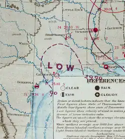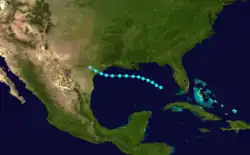 On September 2, a tropical storm developed in the Bay of Campeche. Moving generally towards the west-northwest, the storm reached a peak intensity of 60 mph (95 km/h) on September 4, while approaching northeastern Mexico. Shortly thereafter, the cyclone made landfall in northern Tamaulipas and weakened into a tropical depression on September 5, several hours after crossing into Texas. Moving northward through the state, the storm dissipated on September 7, while located to the southwest of the Dallas–Fort Worth area.[3] Chenoweth argued that this system developed as a tropical depression near the central Gulf of Mexico on September 1 and became much more intense, reaching Category 3 intensity on September 5. The system struck south Texas later that day.[5]