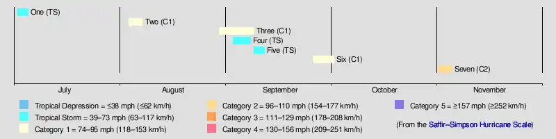Six September 25–September 30 Category 1 hurricane 80 (130) 981 East Coast of the United States (Florida and South Carolina) >$100,000 Unknown [8]