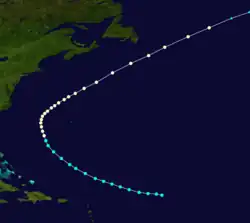 On October 22, the schooners Etna and Mahaska encountered this storm offshore South Carolina,[9]: 46  leading to the track beginning on that date just north of the Abaco Islands in the Bahamas. The storm initially moved to the north, before curving northeastward by the following day. Only slight intensification likely occurred, with the system peaking with winds of 60 mph (95 km/h) early on October 24. Several hours later, however, the storm transitioned into an extratropical cyclone about halfway between Bermuda and Nova Scotia. Before dissipating northwest of Ireland on October 28, the extratropical remnants reached hurricane-equivalent intensity over the northern Atlantic,[6] based on the ship Rhaetia recording sustained winds of 81 mph (130 km/h) and a minimum barometric pressure of 983 mbar (29.0 inHg).[9]: 46–47