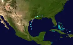 The official track for this system begins as a tropical storm formed north of Puerto Rico on September 16,[11] one day after the steamship Edith Godden reported stormy conditions.[51] Traveling westward, the cyclone passed north of Hispaniola on September 17 and crossed Cuba over the present-day Las Tunas Province on September 18. The next day the storm passed just south of Isla de la Juventud and continued westward before curving north into the Gulf of Mexico. As the storm traveled north, parallel to the east coast of Mexico, it intensified to a 100 mph (155 km/h) Category 2 hurricane. The hurricane maintained this intensity until it made landfall just south of the Mexico–United States border early on September 23. After crossing into Texas,[11] the system possessed a barometric pressure of 973 mbar (28.7 inHg),[1] but quickly weakened and dissipated the next day to the southeast of Austin.[11]