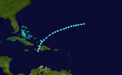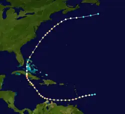 A steamer first encountered this cyclone about 90 mi (145 km) northeast of Barbados on August 15,[42] leading the Atlantic hurricane reanalysis project to begin the track as a tropical storm about 340 mi (545 km) east-northeast of the island. Intensifying into a hurricane later that day, the storm passed over Saint Vincent and just north of Grenada as Category 2 hurricane on August 16 while moving west-southwestward. Entering the Caribbean, the hurricane turned westward and passed just north of the ABC islands on August 18, shortly before curving northwestward. The cyclone struck Jamaica early on August 20, also as a Category 2 hurricane.[11] A ship known as Claribel recorded a barometric pressure of 977 mbar (28.9 inHg), the lowest in relation to the storm.[43] Early on August 22, the system made landfall in Cuba west of Júcaro as a Category 3 hurricane with winds of 120 mph (195 km/h), based on a reanalysis by meteorologist Ramón Pérez Suárez.[37] Turning northward, the cyclone weakened to a Category 1 hurricane before emerging into the Atlantic near Morón later that day. However, it re-intensified into a Category 2 just prior to curving northeastward and striking Grand Bahama early on August 23. Traveling parallel to the East Coast of the United States, the cyclone remained a Category 2 hurricane until August 26 and was last noted about 210 mi (340 km) south of Newfoundland on the following day as a tropical storm.[11]