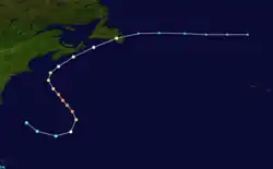The bark Argyll first detected this storm west of Bermuda on August 20,[50] with the official track beginning about 360 mi (580 km) west-southwest of the island. The cyclone moved in a semicircle around the south side of Bermuda and intensified significantly during that time, becoming a hurricane around 06:00 UTC on August 20 and then a major hurricane just 12 hours later,[11] based on the bark Edwin Reed recording a barometric pressure of 962 mbar (28.4 inHg).[51][37] That day, the storm turned northwestward and headed away from Bermuda, before turning northeastward on August 23. Striking the Burin Peninsula of Newfoundland early the next day, the system transitioned into an extratropical cyclone just east of the island around 12:00 UTC. The extratropical remnants moved eastward and dissipated well north of the Azores on August 25.[11]